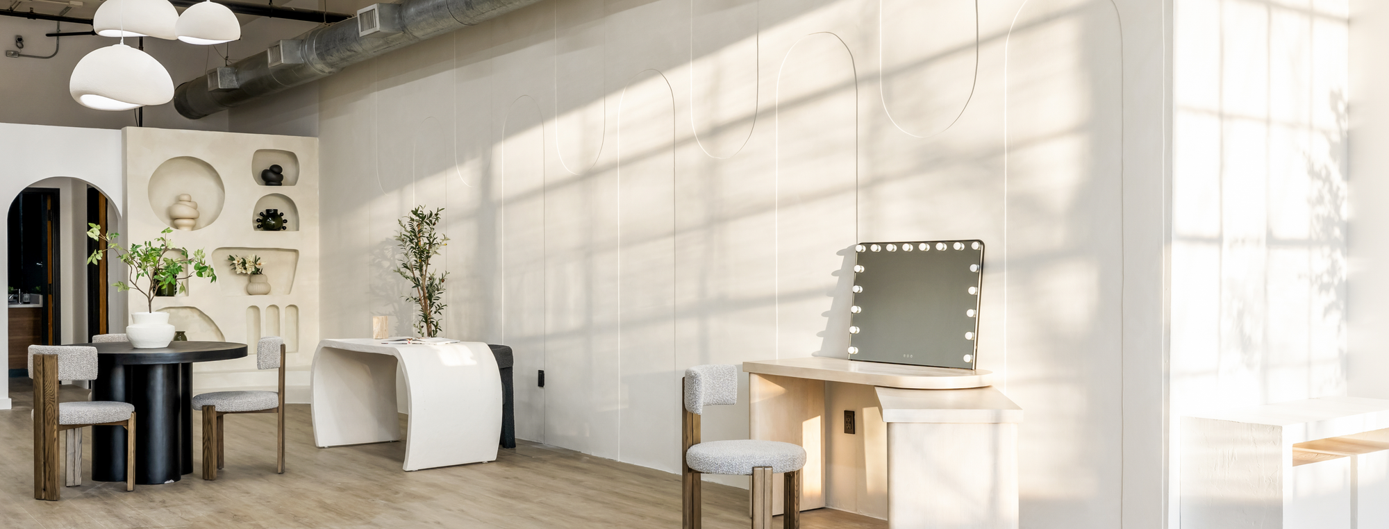 This gorgeous studio boasts custom curved furniture, smooth microcement finishes, and a calming neutral palette, making every angle a beautiful backdrop for your work.